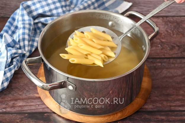 Предварительно отварите макароны в кипящей подсоленной воде до полуготовности. То есть варите ровно половину от времени, указанного на упаковке.