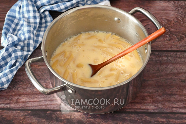Тщательно перемешайте, чтобы яично-молочная смесь попала внутрь макарон.