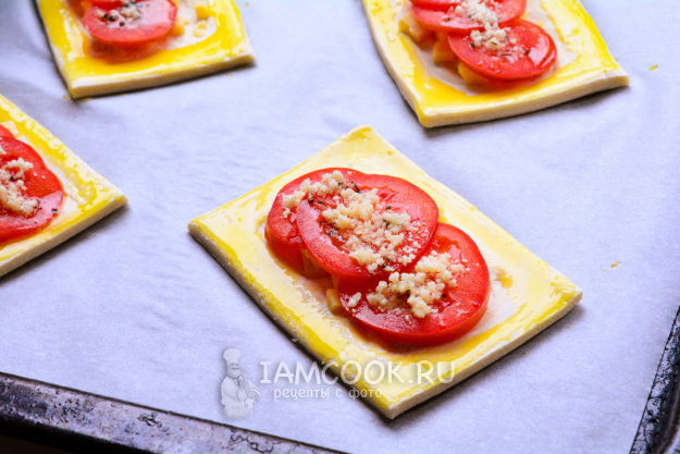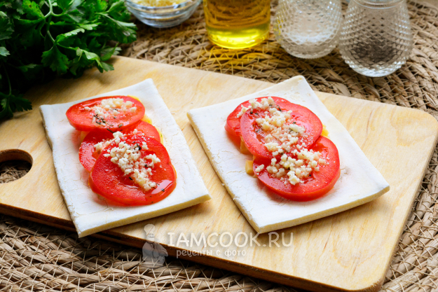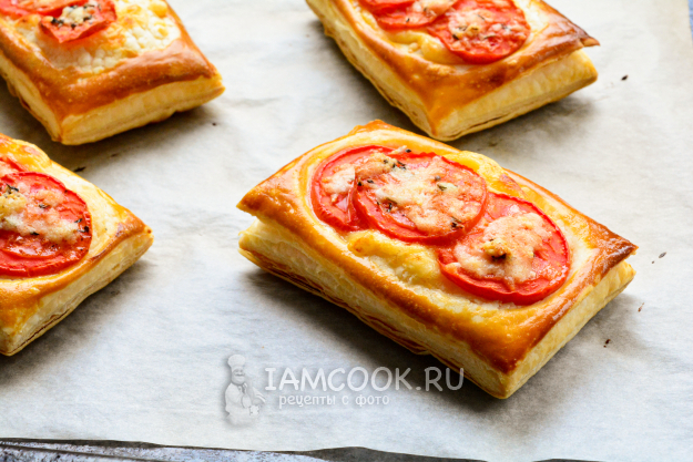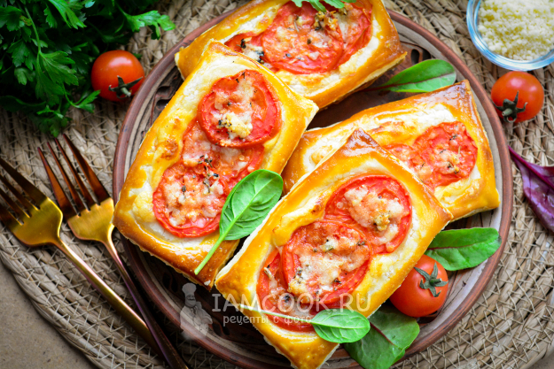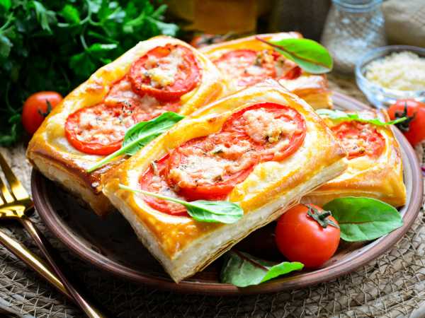 Хрустящие ароматные слойки с сыром и помидорами подавайте к столу.