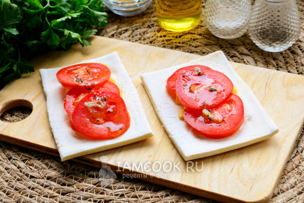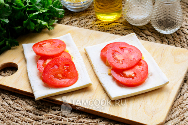Сверху на сыр выложите несколько кружочков тонко нарезанных помидоров.