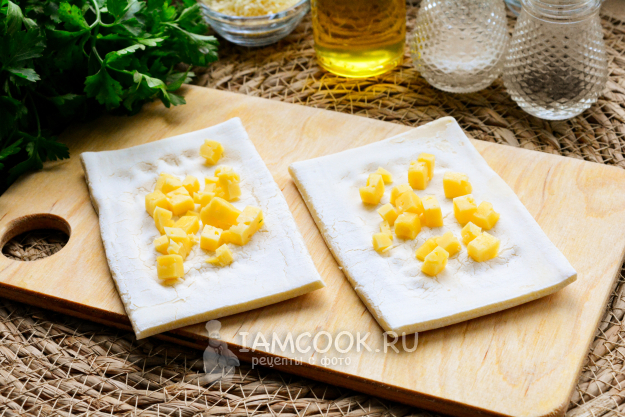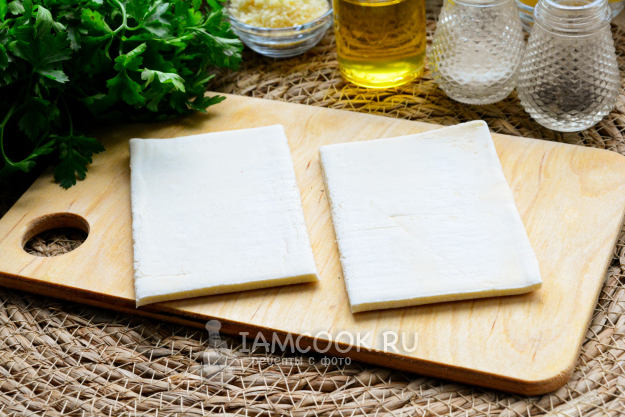 Размороженное слоеное тесто разрежьте прямоугольниками размером примерно 6х10 см.