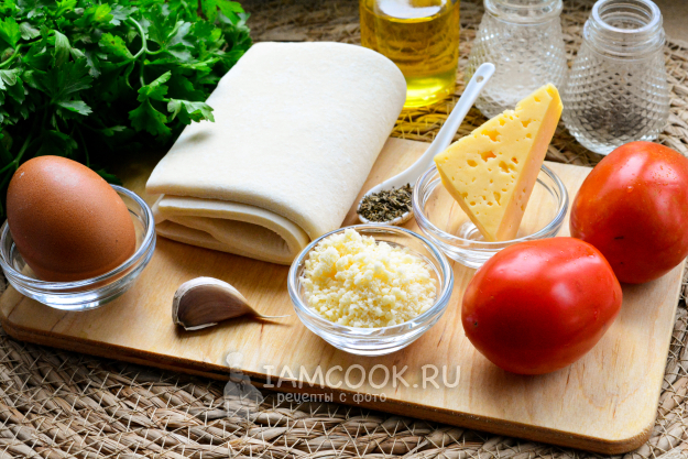 Соберите все ингредиенты для приготовления слоек с сыром и помидорами. Готовое слоеное тесто (здесь бездрожжевое) заранее разморозьте.