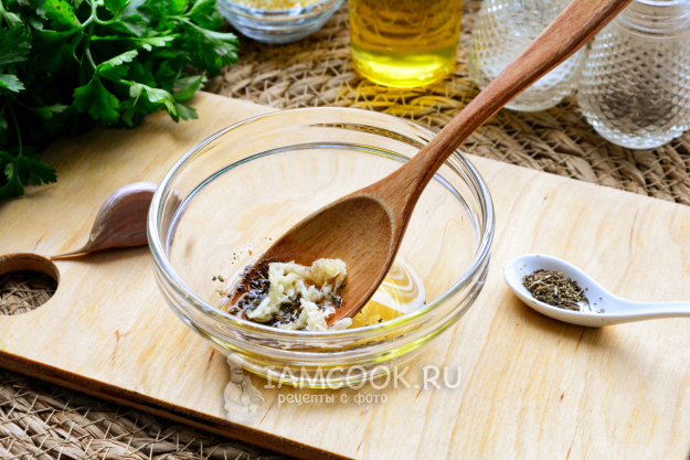 Сразу приготовьте ароматное масло-соус для слоек. В небольшую емкость влейте оливковое масло (холодного отжима) и добавьте туда прованские травы, измельченный чеснок для аромата. Посолите, поперчите по вкусу, перемешайте.