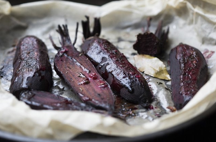 Запекать свеклу следует при температуре 200 градусов. Предварительно клубни свеклы разрезаем на 4 части и раскладываем на бумагу на противень. Теперь дело маринада. Мы используем немного оливкового масла и специй для вкуса. Маслом поливаем содержимое противня сверху и ставим на полчаса. В середине процесса надо перевернуть клубни. В результате получится сочный ароматный гарнир, который можно использовать и как составную часть к салату.