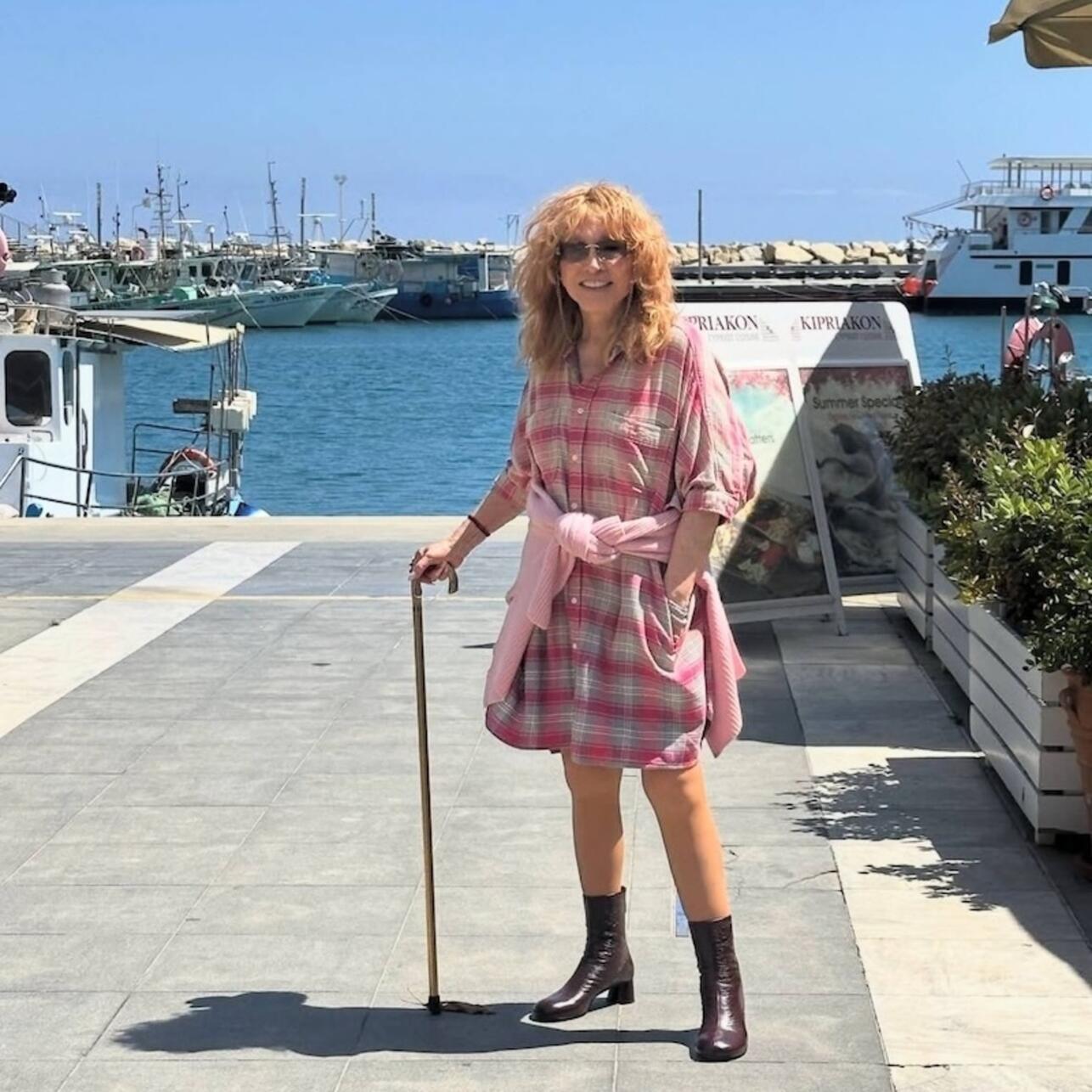 Алла Борисовна на этом кадре позирует в платье-рубашке в клетку, полусапожках и с тростью в руках. Образ она дополнила кофтой, которую она небрежно повязала на бедрах, и солнцезащитными очками. Снимок был сделан во время очередной прогулки Пугачевой на Кипре, где она живет уже несколько лет.