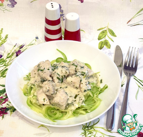Спагетти из цуккини — отличная альтернатива традиционным спагетти, их очень легко и быстро готовить, их достаточно отварить несколько минут. Сливочный куриный соус с твёрдым сыром также готовится быстро и гарантированно получится идеальным.