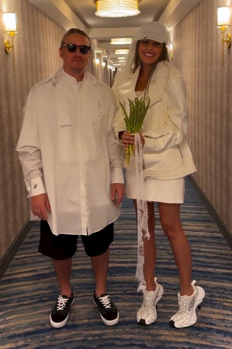 На торжестве Горбань выбрала яркое мини-платье с открытыми плечами и латексную куртку, а вместо классических лодочек надела белые кроссовки на черной шпильке. У нее была ажурная фата с кепкой, а также необычный букет — связка зеленой спаржи. Кирилл выбрал белую рубашку с оригинальным воротником, черные шорты и кеды.
