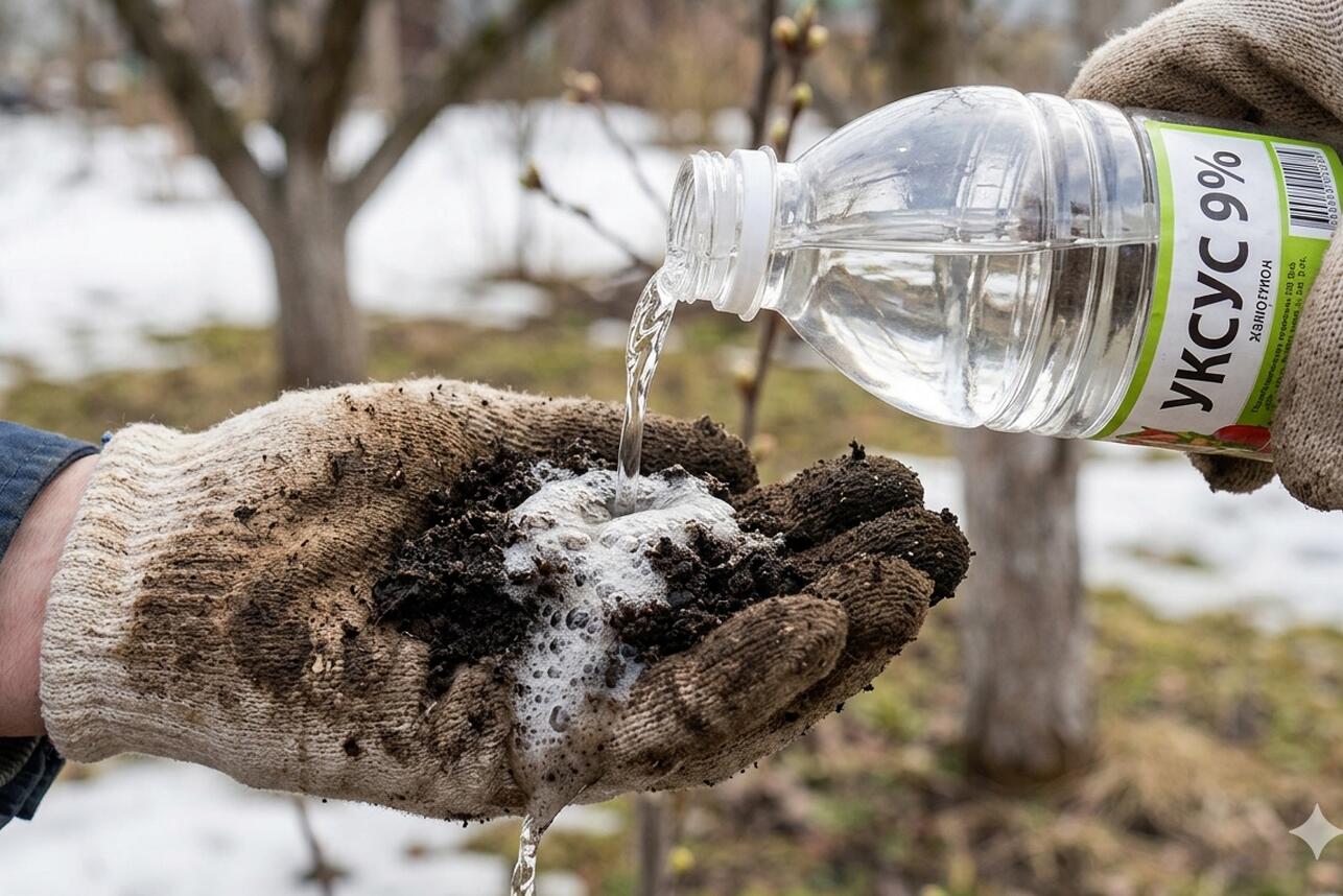 - Тест на щелочь: Капните в раствор 9%-й уксус. Если появятся шипение и пена — почва щелочная, слабо-нейтральная; если реакции нет — почва кислая.