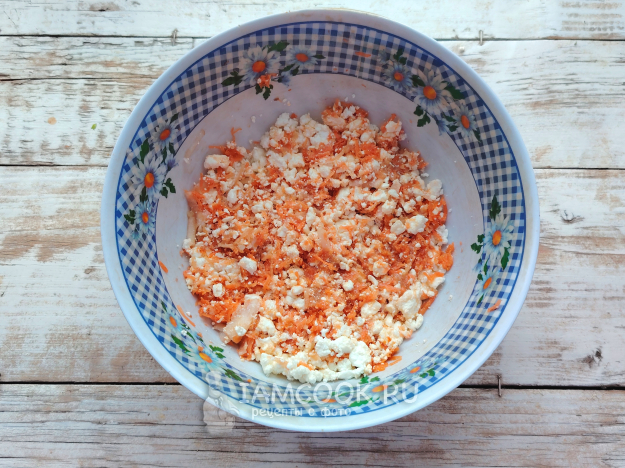 Творог подойдет даже зерновой, но в таком случае его необходимо растереть до однородности блендером или вилкой, можно это сделать сразу с добавлением сахара. Сахар можно и не добавлять совсем, если фрукт и овощ достаточно сладкие.
