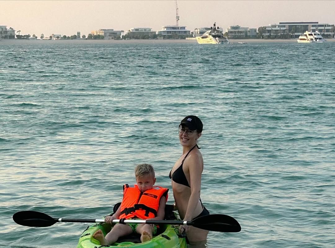 "Море на детские каникулы — это лучший подарок, я считаю. А в тихой Bvlgari-бухте впервые опробовали каякинг вместо джетски. Мама очень довольна, потому как каякинг не дребезжит, не боишься, что он куда-то врежется, ну и вообще руки красивые накачать веслом на отдыхе — дело хорошее", — написала звезда под фото.