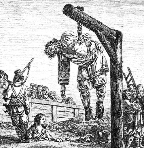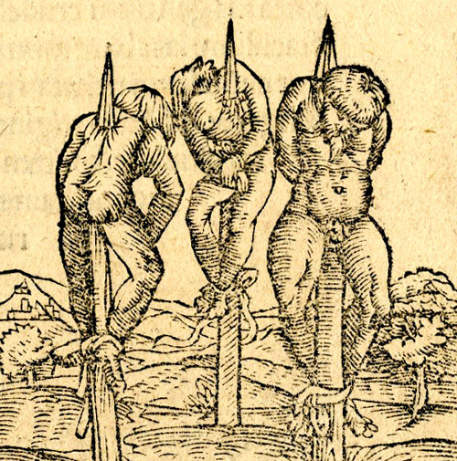 На Руси практиковали подвешивание на крюк. В основном эта казнь применялась к разбойникам и служила назиданием для остальных, чтобы те понимали – «большая дорога» до хорошего не доведет. Приговоренному втыкали под ребро крюк и подвешивали. Руки связывали за спиной, чтобы жертва не могла выпутаться. Человек мог провисеть так несколько дней, до тех пор, пока не умрет.