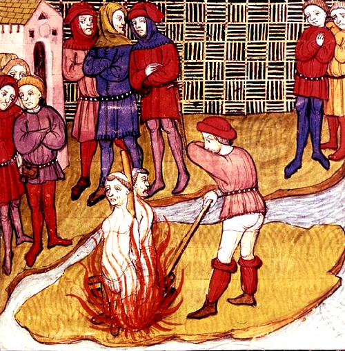 Это излюбленный способ Святой инквизиции применялся для того, чтобы казнить еретиков и ведьм. Считалось, что огонь очищает душу и способствует ее спасению. Но легенда об очищении не уменьшает жестокости такой казни. Сначала у человека обгорали все волосы на лице, затем начинали сгорать ткани. При этом казнимый вдыхал раскаленный воздух и этим сжигал себе легкие. Этой жуткой, мучительной смертью умер ученый Джордано Бруно, знаменитая Жанна Д’Арк и множество других достойных людей.