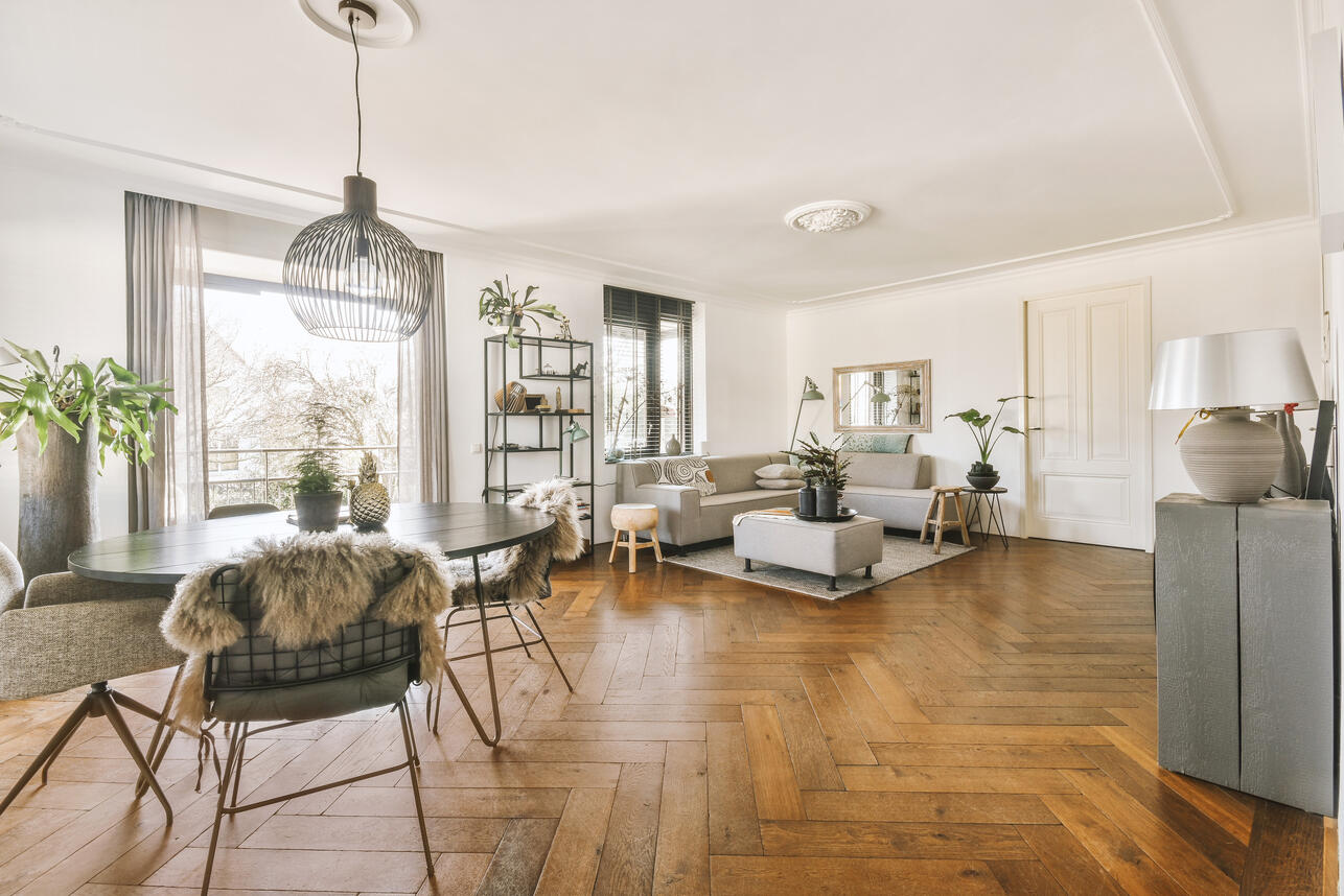 Для тех, кто хочет дорого и красиво, лучше выбирать натуральные материалы — инженерную доску или штучный паркет. Для более доступного варианта подойдет кварц-виниловое покрытие с качественной текстурой дерева.
