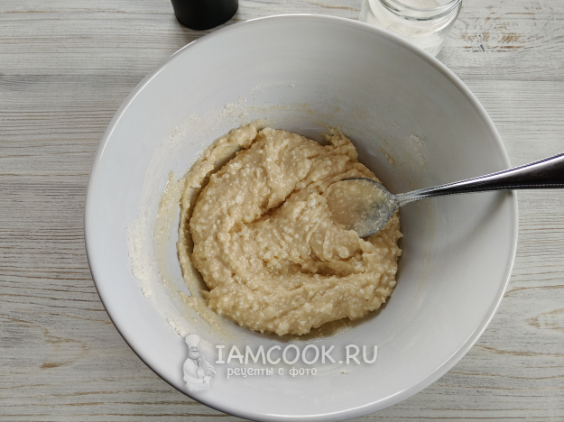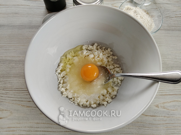 В творог добавить соль, сахар, ванилин, масло и яйцо.