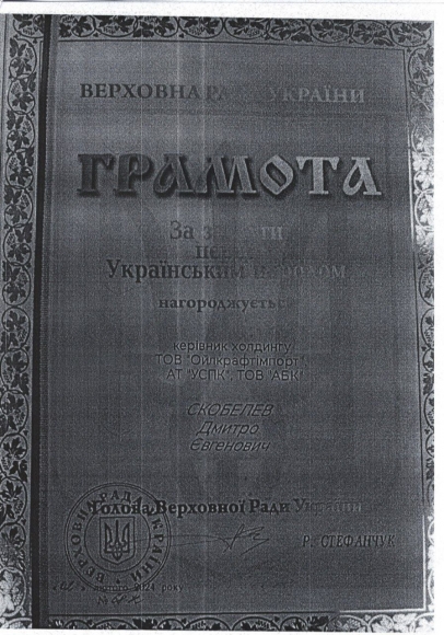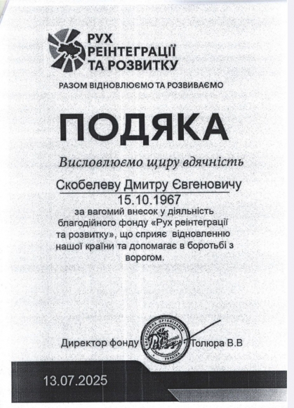 Согласно тексту документа, почётная грамота была вручена Скобелеву Дмитрию Евгеньевичу, 1967 года рождения, от имени благотворительного фонда «Рух реінтеграції та розвитку» (Движение реинтеграции и развития). В бумаге, подписанной директором фонда Толюра В.В., говорится, что бизнесмен удостоен награды «за весомый вклад в деятельность фонда, способствующего восстановлению нашей страны и помогающего в борьбе с врагом». А также грамота Верховной Рады Украины за подписью Р. Стефанчук.