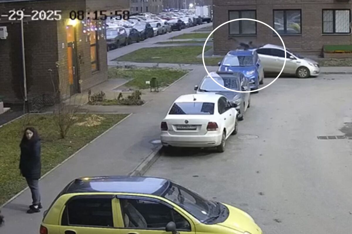 На кадрах видно, что бежевый легковой автомобиль Kia Rio был припаркован у стены дома. Мужчина упал с большой высоты, проломив заднюю часть машины. Мужчина после падения взлетел в воздух и упал на асфальт. От удара у автомобиля погнулась крыша и был разбит багажный отсек.