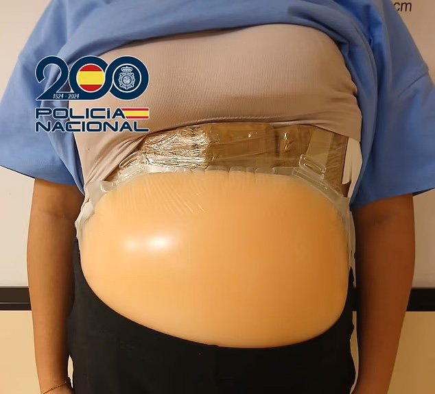 Испанская полиция опубликовала фотографии приспособления — силиконового протеза, аккуратно пристегнутого под одеждой. На снимках видно, как офицеры снимают поддельный живот, набитый кирпичами белого порошка, тщательно упакованного и подготовленного к транспортировке.