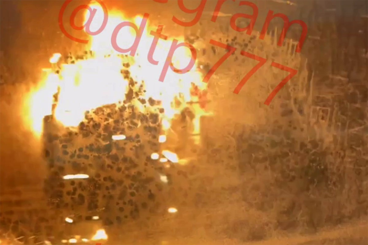 Очевидцы запечатлели инцидент на видео. На кадрах видно, что автомобиль горит на обочине дороги, при этом пламя охватило транспорт не полностью: вспыхнула водительская кабина.