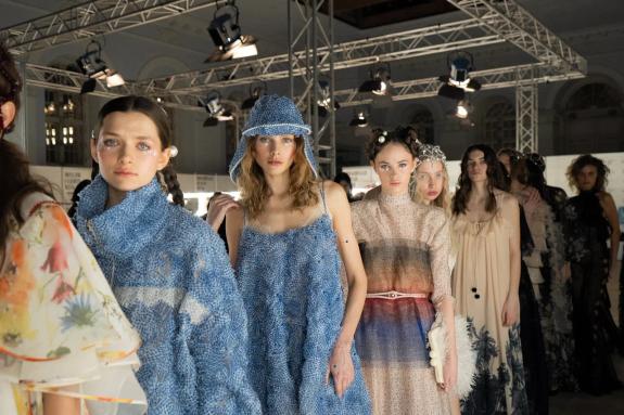 Многие бренды опирались на культурные коды, философию, мифологию, а также рассуждали о технологическом прогрессе и мире будущего. Так, на подиумах русский культурный код переплетался с киберпанком, морская эстетика — с вечерней элегантностью, а ретро-футуризм — с современным минимализмом.