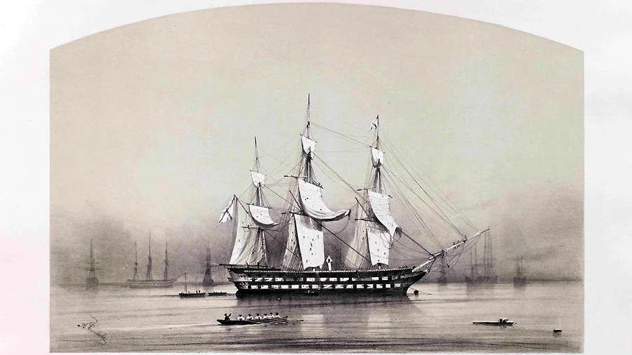 84-пушечный корабль «Императрица Мария», под фагом вице-адмирала Нахимова, после победы в Синопе. 1854 год. Литография