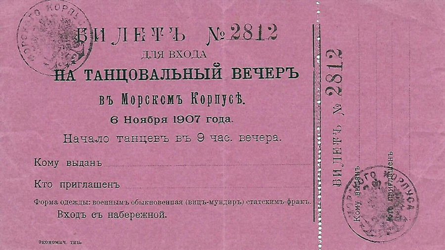То, как наше учебное заведение было вплетено в жизнь России, достойно удивления и восхищения: тут и министр просвещения Александр Шишков, и морской министр, знаменитый реформатор адмирал Николай Мордвинов, и выдающийся кораблестроитель академик Алексей Крылов... Жизнь светского Петербурга была немыслима без наших кадет и офицеров. Столичный бальный сезон начинался ежегодно 6 ноября, в корпусной день, в Столовом зале Морского корпуса. На выставке, кстати, есть сохранившийся входной билет на один из таких балов...