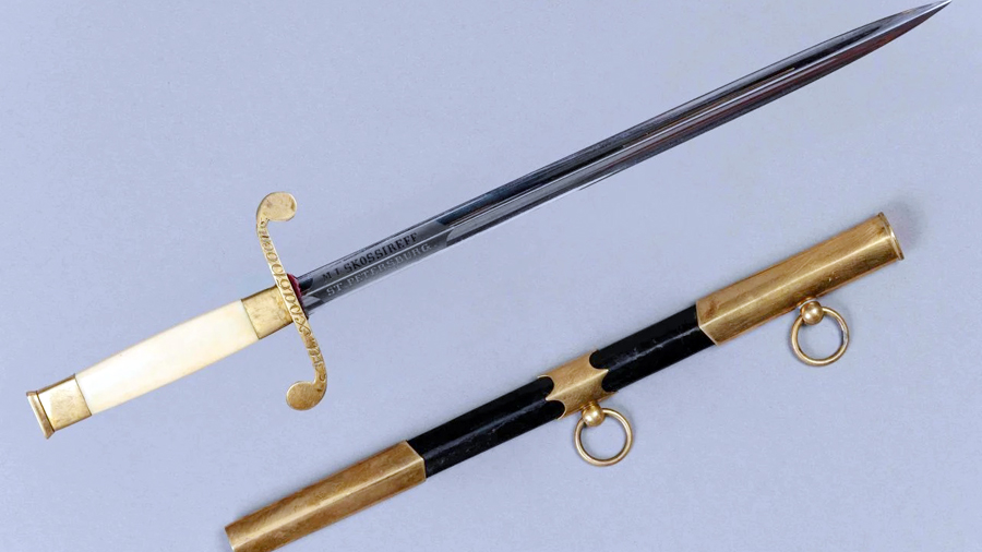 Наградное аннинское оружие «За храбрость» морской офицерский кортик. Конец XIX — начало XX в. Сталь, латунь, кость, дерево, кожа, эмаль; ковка, литье, резьба, травление, золочение, эмальерные работы, полировка