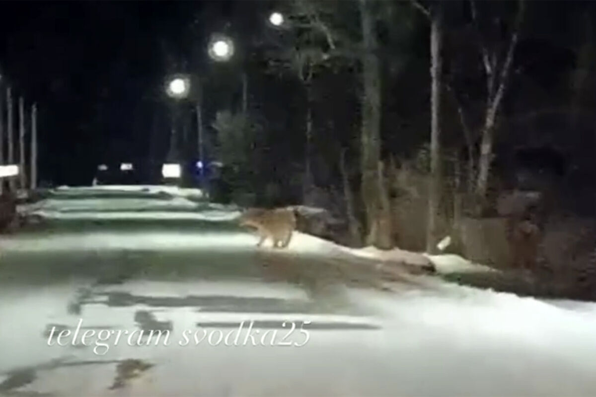 Очевидцы запечатлели инцидент на видео. На кадрах видно, как хищник идет по проезжей части в необорудованном для пешеходов месте. Увидев автомобиль, тигр прыгает через забор частного дома. На записи также слышно, как местные жители призывают всех оставаться дома.