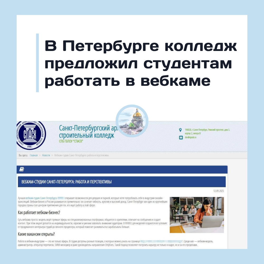 Внимание интернет-пользователей привлекло Санкт-Петербургский архитектурно-строительный колледж, на официальном сайте которого нашли статью о наборе молодых людей для работы в вебкам-студии. Студентам предлагали совмещать учёбу с работой в одной из крупнейших подобных компаний в стране.