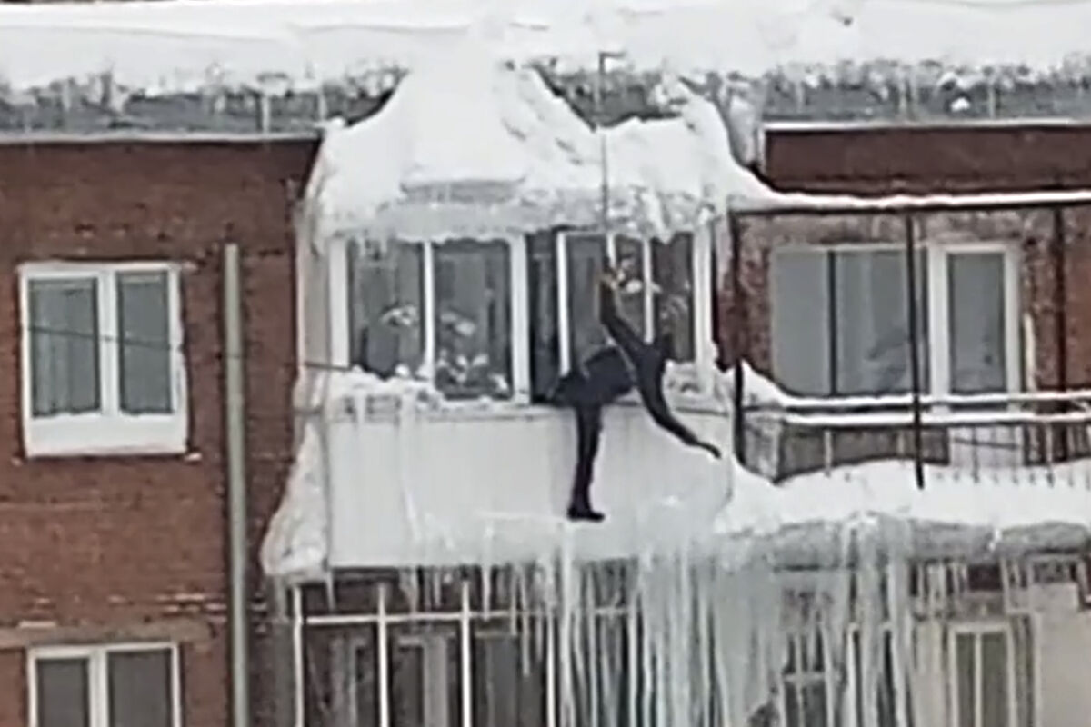 Сибиряка сняли из соседнего дома. Голос за кадром назвал жильца дома напротив "экстремалом" и объяснил, что жильцы должны сами сбивать со своих балконов сосульки.