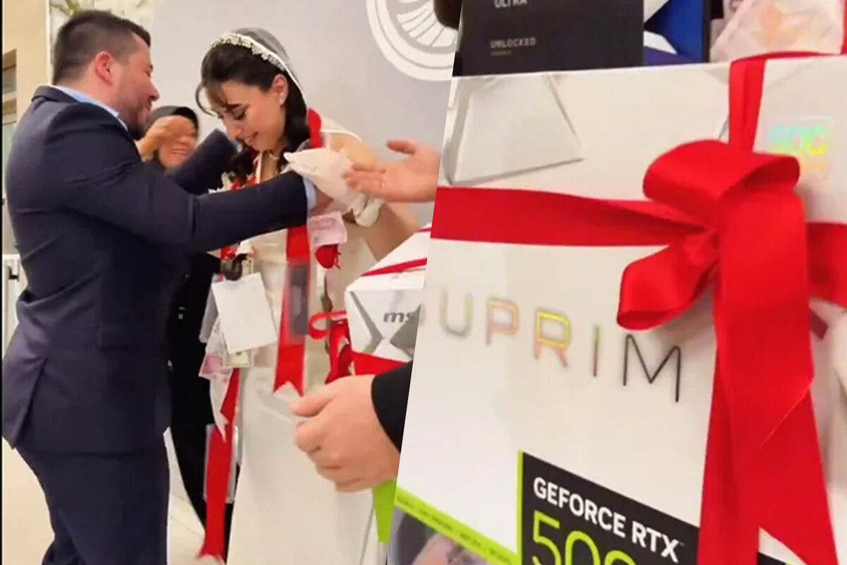 Среди наиболее заметных подарков была замечена флагманская видеокарта MSI Suprim GeForce RTX 5090 в белом исполнении. Это одна из самых дорогих видеокарт на рынке. Позднее жених получил от других гостей процессор Intel Core Ultra, а невесте был вручен комплект четырехканальной оперативной памяти DDR5.