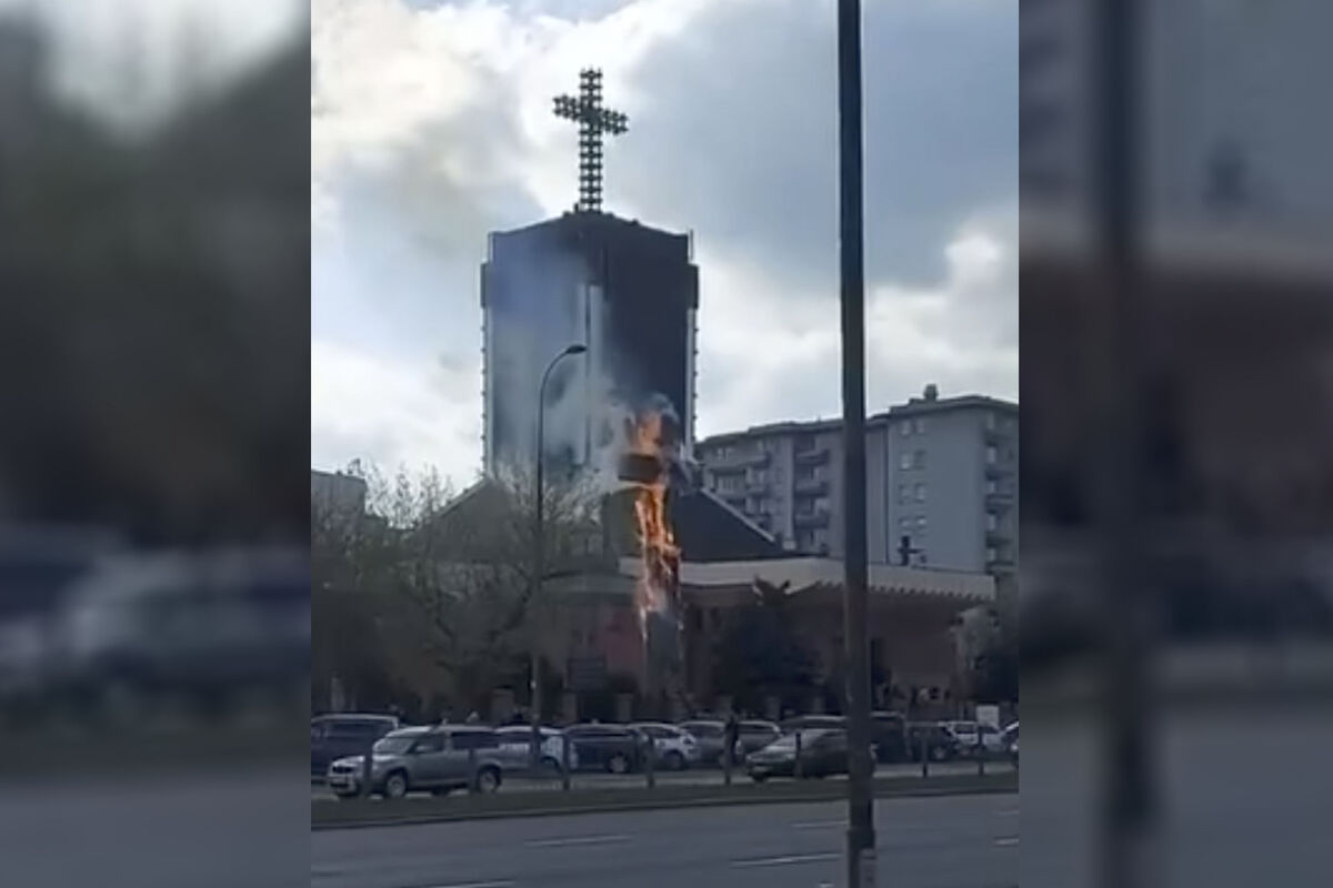 Издание пишет, что возгорание 25-метрового креста перед церковью св. Максимилиана Кольбе произошло накануне днем. Пожар заметил один из верующих. Пожарным удалось оперативно потушить возгорание, поэтому металлическая конструкция креста не пострадала. Его получится восстановить.
