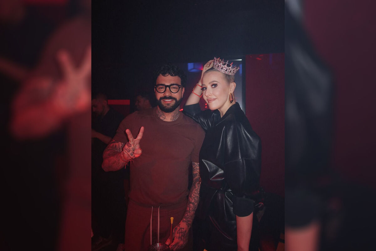 Ксения Собчак пришла на вечеринку в клуб рэпера Тимати. Журналистка выбрала для закрытого мероприятия черный кожаный комбинезон и золотые массивные серьги. Телеведущая дополнила образ короной. Знаменитости сделали укладку и макияж с розовыми тенями, черной тушью и блеском для губ. На фото Ксения Собчак позировала вместе с Тимати.