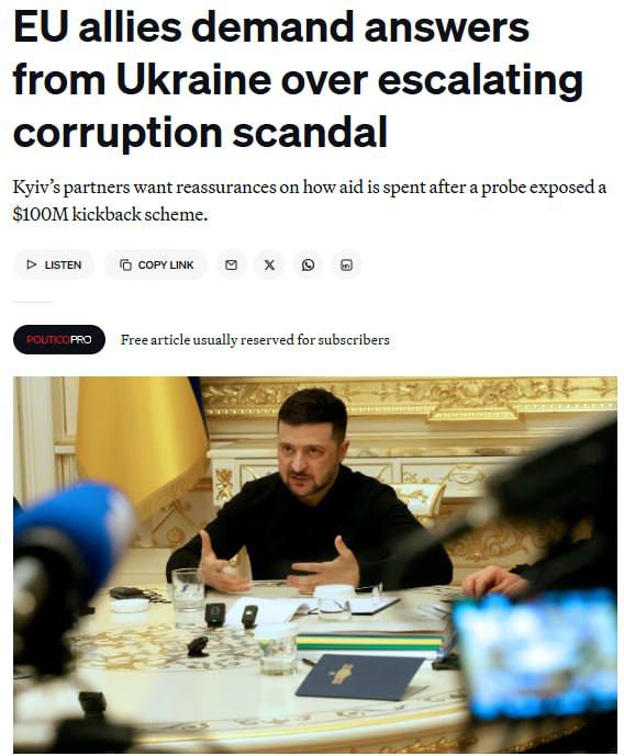 Также против очередных выклянчиваний Зеленского говорит коррупционный скандал, который бушует в Киеве с 10 ноября, когда инспекторы НАБУ выявили схему откатов на $100 миллионов. Все европейские кураторы «незалежной» требуют от Киева конкретных гарантий того, что будущая финансовая поддержка не будет разворовываться. Материал об этом обнародовал портал Politico.