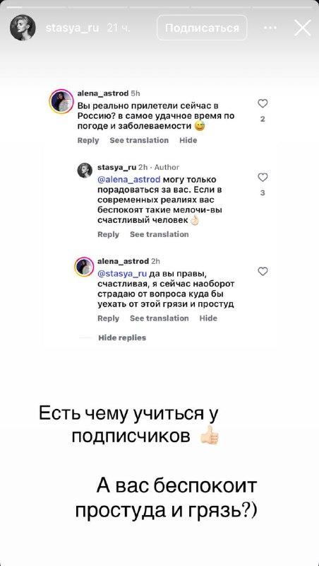 «Мы наконец решились на это! Три самолета! 22 часа в пути! Саша и я нехило стрессанули, но все это ради очень важного открытия для дочки! Здравствуй, дом!» — такими словами Анастасия Задорожная сопроводила видеоролик, объявив о своем возвращении. Поклонники, давно скучавшие по московской жизни любимой артистки, тут же принялись поздравлять ее с этим значимым событием. Однако нашлись и те, кто не скрывал своего удивления, задаваясь вопросом о своевременности такого переезда. Один из пользователей напрямую поинтересовался, почему семья выбрала для возвращения именно холодное время года и, как он выразился, «противную погоду».