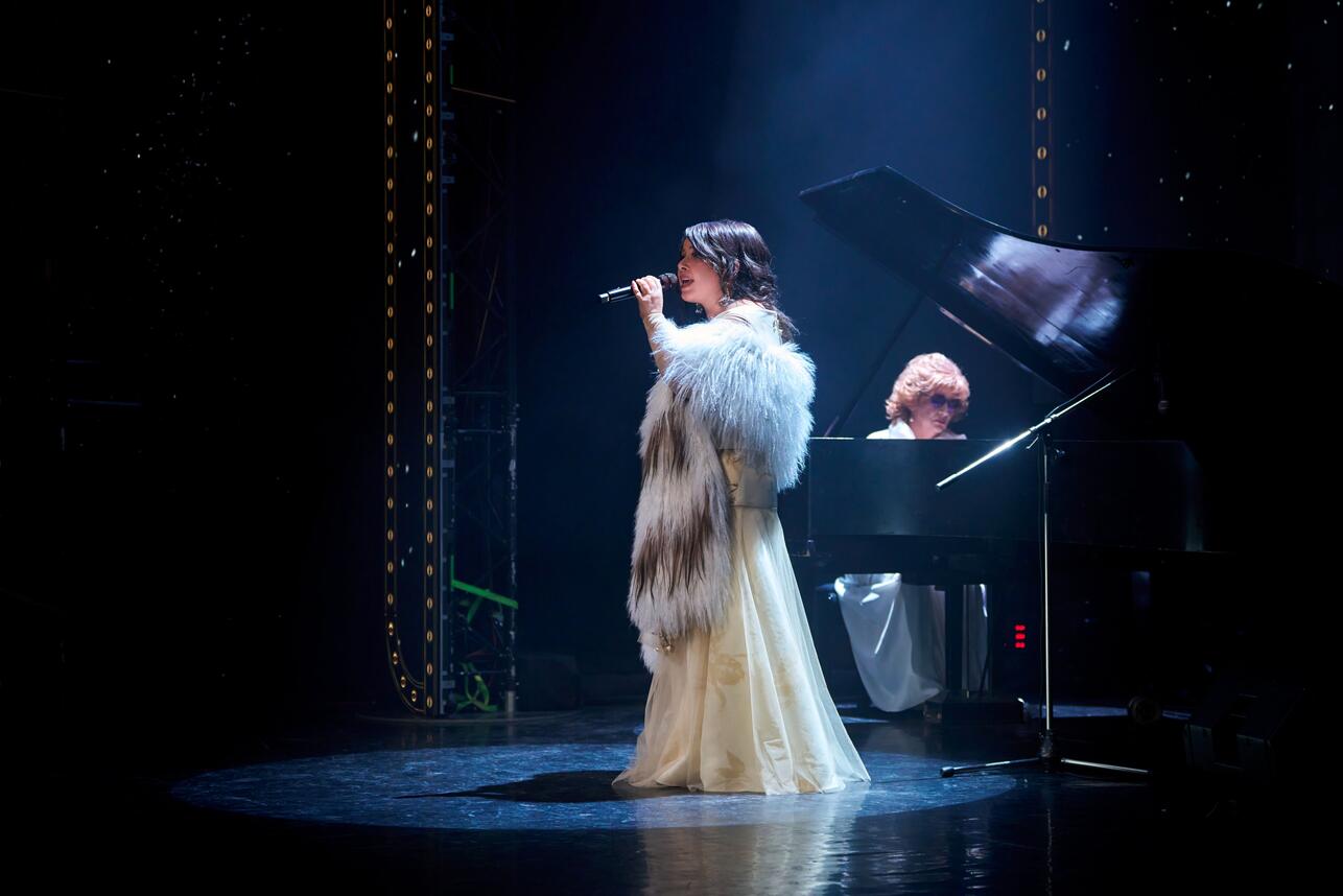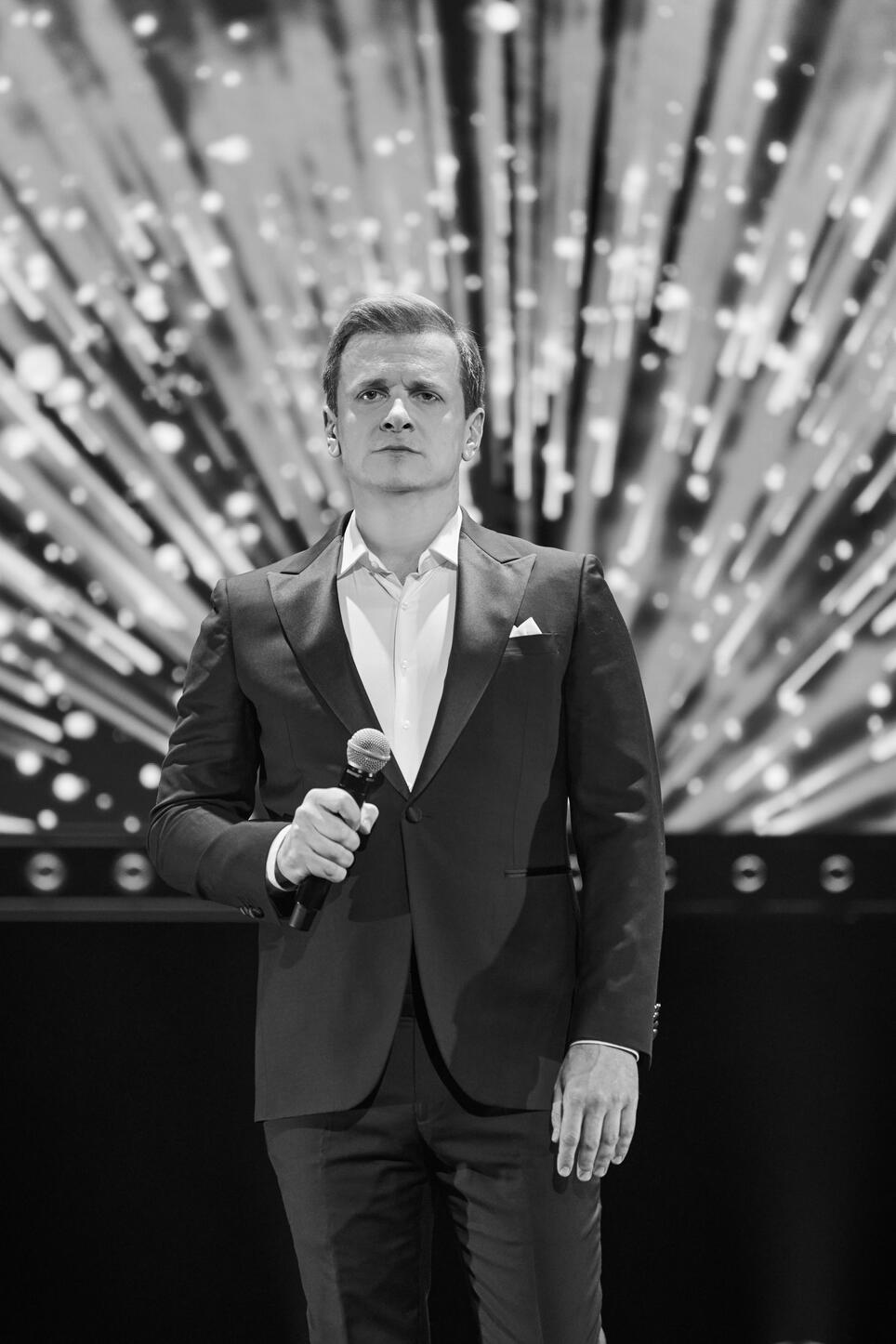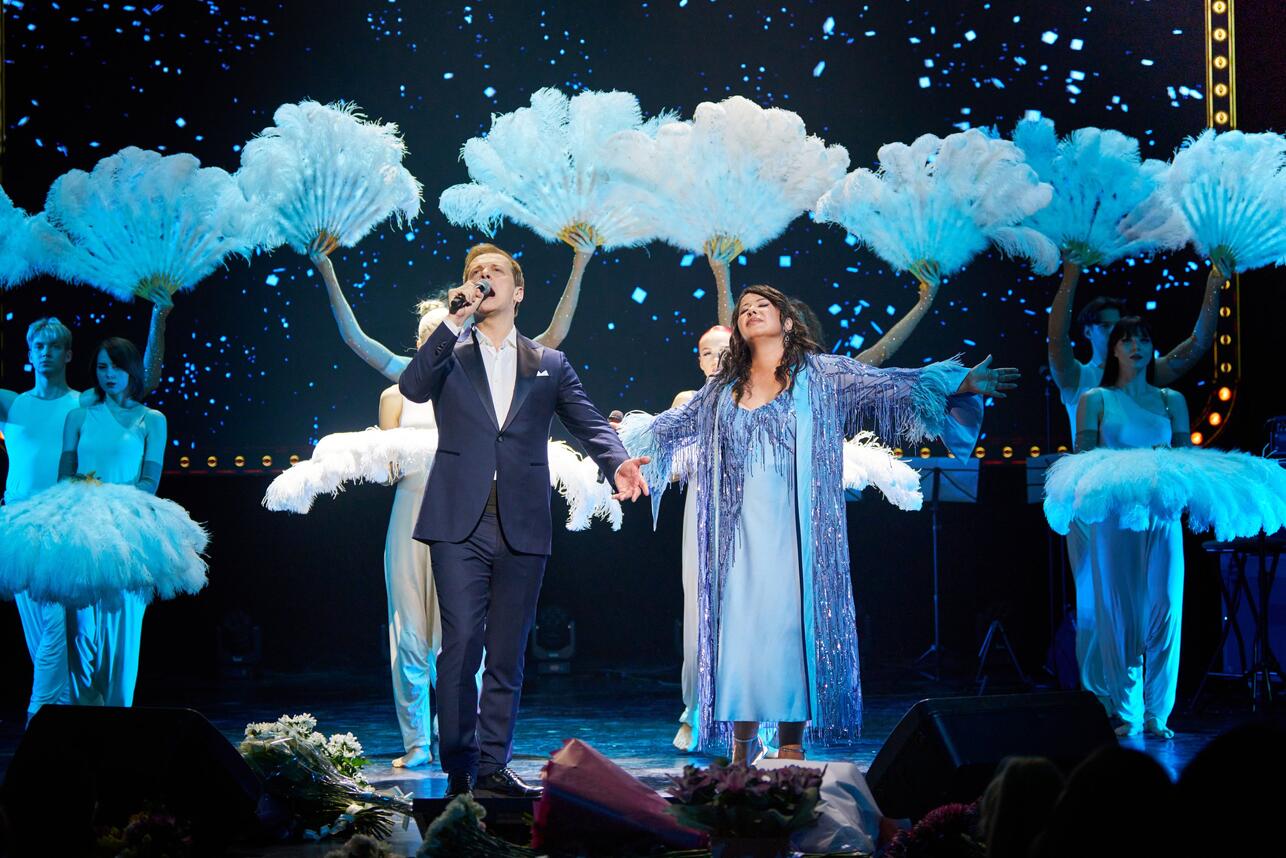 Глеб Матвейчук и Инна Рудник Сергей ПечораПрежде чем перейти к содержанию программы, хотелось бы обратить внимание и на форму. Говоря об этом, можно сделать акцент на двух именах соучастников этого концерта. Режиссер концерта — заслуженный деятель искусств России Максим Лахно — главный режиссер Театра «Русская песня», чьи шоу и спектакли с большим успехом идут и на других российских театральных и концертных площадках. Чего только стоит программа «Голоса вселенной», созданная к юбилею ансамбля «Русская песня»! Лахно — замечательный профессиональный постановщик, блестяще владеющий не только режиссерским ремеслом, но и тонко чувствующий эстрадный жанр, который мы так стремительно теряем. И благо, что есть такие мастера, как Максим, которые стараются традиции сохранить. И в программе «Пообещайте мне любовь» Лахно собрал все лучшие ингредиенты хорошего концерта. Это и грамотная последовательность номеров — от мажорных аранжировок к лирическо-драматическим и «разгульным» в финале, это и отличный видеоряд, и профессиональная работа со светом и звуком, и уместное точечное появление балета. Все, что происходит на сцене и за кулисами, работает на артистов — не тянет одеяло на себя, не заглушает, не перебивает смыслов, а гармонично дополняет и усиливает музыкальные и поэтические акценты, заостряя внимание зрителя в кульминационных местах. И второй человек, работу которого можно было бы условно отнести к внешнему — кутюрье Игорь Гуляев, в нарядах которого весь вечер блистала Инна Рудник. Но говорить о Гуляеве как о мастере формы было бы несправедливо, Гуляев — про содержание! Потому что все его сценические костюмы не случайны, они соответствуют тем песням, которые актриса в них исполняла. Вот она — гармония формы и содержания! Сам маэстро тоже присутствовал в зале, и не один — со своей мамой. А много ли сегодня найдется концертов, на которые не стыдно привести своих родителей? «Пообещайте мне любовь» — как раз один из таких. И, конечно, зал всякий раз вздыхал и готов был разразиться аплодисментами, когда Инна Рудник появлялась на сцене в очередном наряде от кутюр, не похожем на предыдущие.
