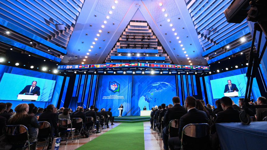 В зале представители Китая, Венгрии, Мьянмы, Индии, всего — 48 государств. Основная тема — «Глобальный мировой беспорядок и головоломка евразийской безопасности».