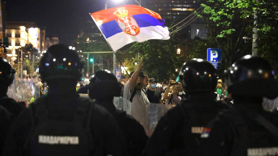 По данным ведомства, группа участников «необъявленного митинга» на улице князя Милоша напала на граждан, присутствовавших на зарегистрированном собрании в парке Пионеров. Протестующие бросали в людей различные предметы и пиротехнику, после чего одна из палаток загорелась.