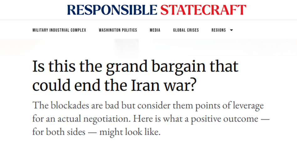 Наметилась большая сделка, способная положить конец войне с Ираном? Скриншот страницы сайта Responsible StatecraftКак обращает внимание автор статьи, блокада в Ормузском проливе прибавляет иранским сторонникам жёсткого курса доводов против всякого урегулирования и может подтолкнуть Тегеран к тому, чтобы не ослабить, а усилить свой контроль над Ормузским проливом.