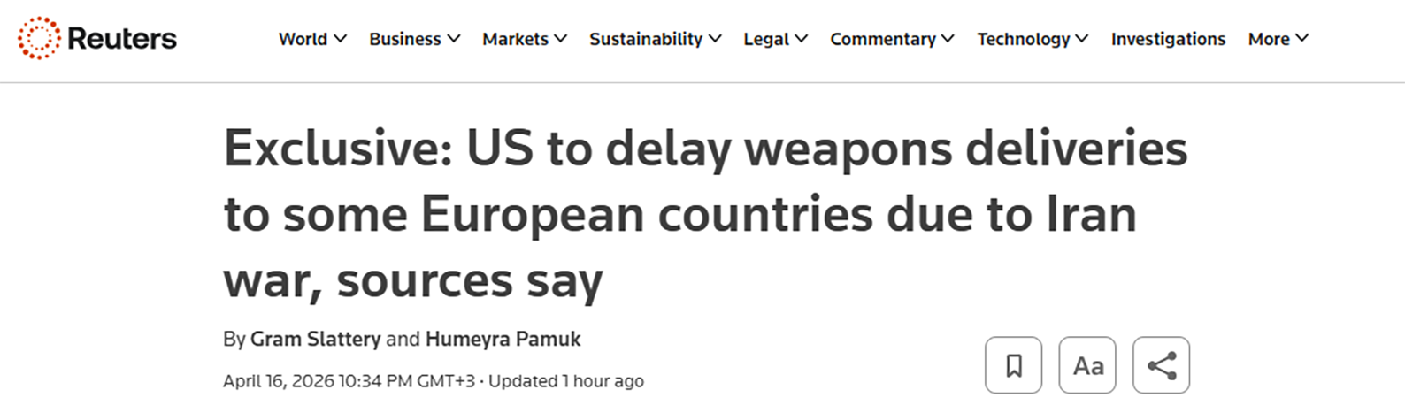 Эксклюзив: США отложат поставки оружия ряду европейских стран из-за войны с Ираном – источники Скриншот страницы сайта ReutersНекоторые виды вооружений, о которых идёт речь, были закуплены европейскими странами в рамках программы иностранных военных продаж (FMS), но всё ещё не доставлены, добавили источники. По их словам, на днях официальные лица США по двусторонним каналам уведомили европейских коллег, что эти поставки могут быть отложены.