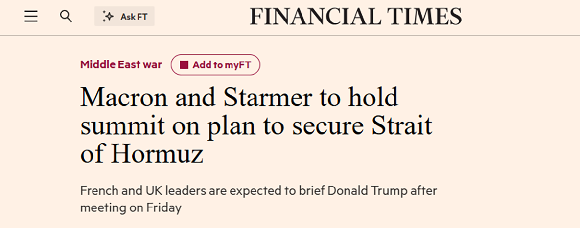 Макрон и Стармер проведут саммит по плану обеспечения безопасности Ормузского пролива Скриншот страницы сайта Financial TimesПо данным газеты, Дональд Трамп не будет участвовать в этих переговорах. Однако британский премьер Кир Стармер и президент Франции Эммануэль Макрон проинформируют его об итогах мероприятия.