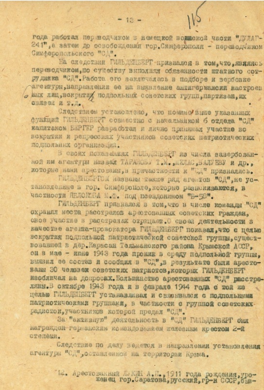 «Работа его заключалась в подборе и вербовке агентуры, направлении её на выявление антигермански настроенных лиц, вскрытия подпольных советских групп, партизан, их связей и т.д. Гильденберг показал, что с целью вскрытия подпольной патриотической советской группы, существовавшей в дер. Карасан Тельманского района (сейчас село Ровное Красногвардейского района — Прим.) Крымской АССР, он в мае-июне 1943 года проник в среду подпольной группы, выявил её состав и сообщил в СД, в результате были арестованы 30 человек советских патриотов, которых Гильденберг изобличал на допросах. Большинство арестованных СД расстреляны», — констатировали страшный результат работы предателя в НКГБ.