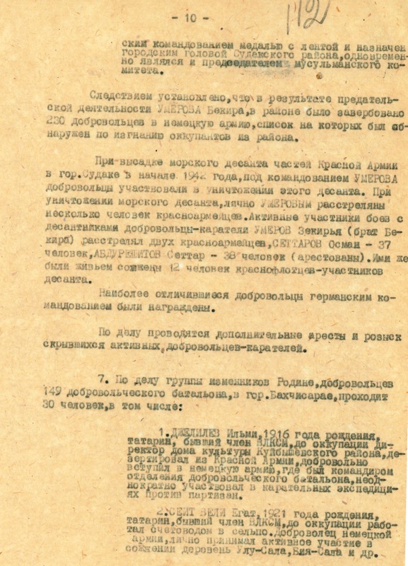 Так, в Судаке советские спецслужбы разоблачили и арестовали группу добровольцев-карателей. Основной фигурой этого дела оказался Бекир Умеров — сын муллы, судимый советским судом за растрату, а при оккупантах ставший старостой деревни Малый Таракташ (сейчас Дачное). Оперативники НКГБ установили, что он не только активно вербовал солдат в немецкую армию, но и организовывал карательные рейды против партизан и освободителей полуострова. «При высадке морского десанта частей Красной Армии в гор. Судаке в начале 1942 года под командованием Умерова добровольцы участвовали в уничтожении этого десанта. При уничтожении морского десанта лично Умеровым расстреляны несколько красноармейцев. Ими же живьём были сожжены 12 человек краснофлотцев — участников десанта», — говорится в докладе НКГБ Крымской АССР.