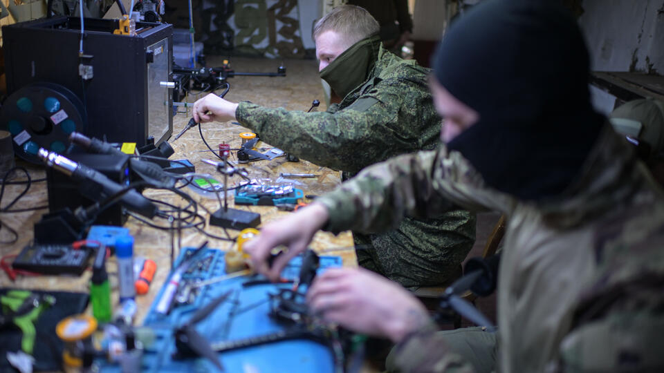 "Это лаборатория по производству дронов и подготовке людей, которые будут этими дронами управлять, находится в непосредственной близости к линии боевого соприкосновения, около 15 километров до противника. Мы сейчас в зоне поражения его беспилотных систем, тем не менее мы очень глубоко под землей и практически неуязвимы для врага, поэтому я так смело передвигаюсь без бронежилета и каски", – сообщил корреспондент "Известий" Егор Кильдибеков.