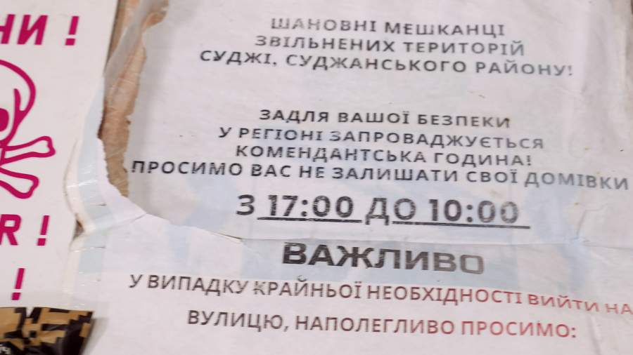 Объявление, снятое со стены дома в Судже, — «Увага! Шановниi мешканцi звiльнених територiй Суджi. Задля вашої безпеки у регiонi запровадждуеться комендатська година! Просимо вас не залишати свої домiвки з 17:00 до 10:00». Перевод: «Внимание! Уважаемые жители освобожденных территорий Суджи. Для вашей безопасности в регионе вводится комендантский час. Просьба не покидать свои жилища с 17:00 до 10:00». Обращает внимание на себя время — после 17:00 уже нельзя выходить на улицу. Фраза — «освобожденной Суджи». И, конечно, язык: вероятно, предполагалось, что с жителями уже требуется говорить на мове, независимо — понимают они или нет…