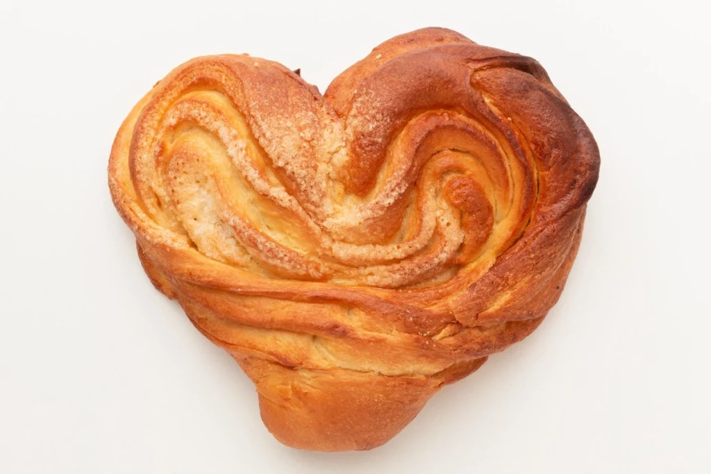 Тесто оставляют на 40 минут в теплом месте, чтобы оно поднялось и стало воздушным, затем обминают и делят на 15 кусочков. Каждый кусочек расплющивают, смазывают растопленным маслом и щедро посыпают сахаром — именно он создает ту самую карамельную корочку. Лепешку сворачивают рулетиком, складывают пополам, делают надрез почти до конца и аккуратно раскрывают — получается плюшка в форме сердечка.