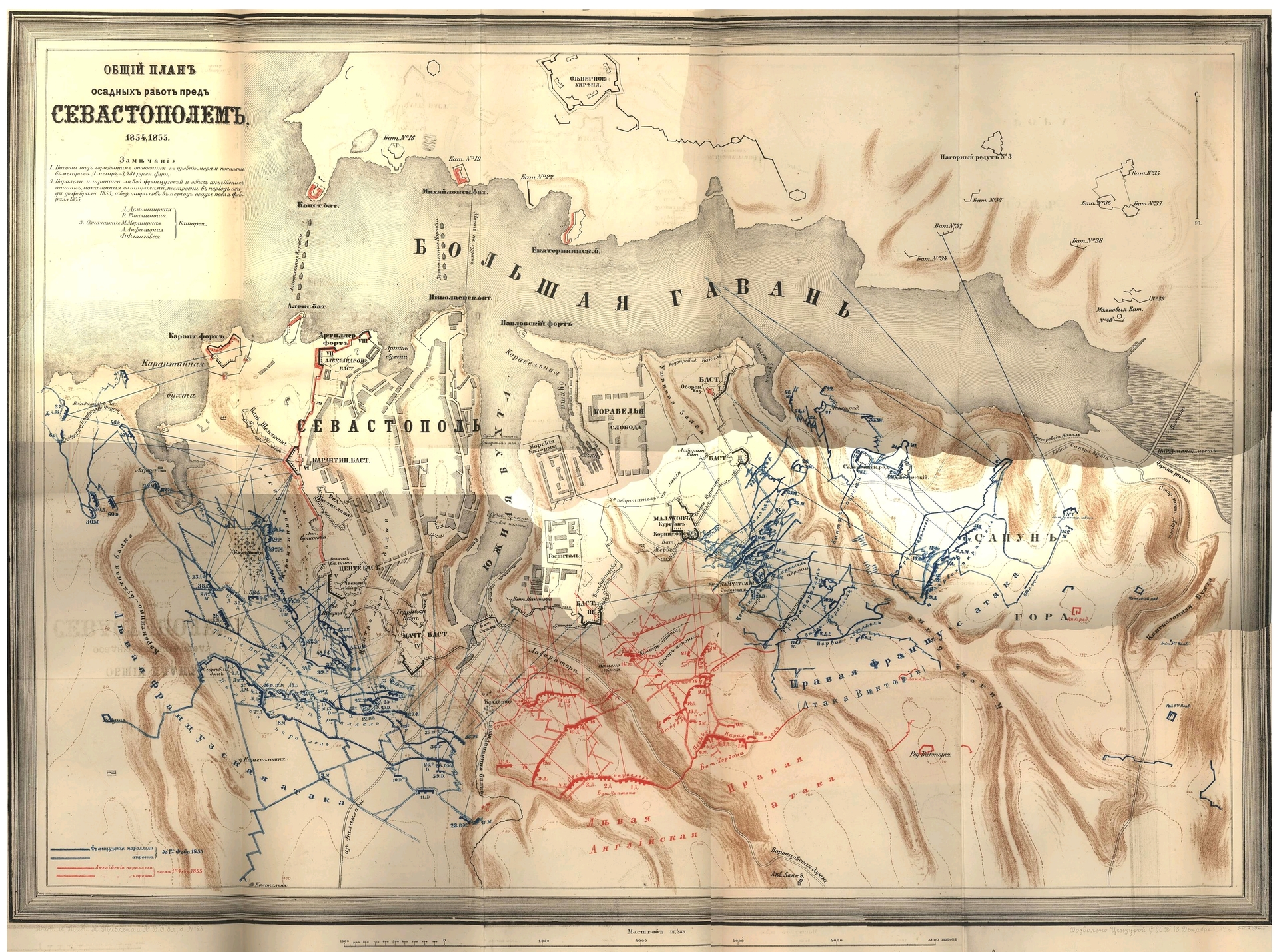 Общий план осадных работ перед Севастополем в 1854-1855 годах Общественное достояниеВ октябре подразделения западной коалиции подвергли Севастополь первой масштабной бомбардировке и не допустили попытки основных сил русской армии в Крыму деблокировать город. При этом Николай I не мог перебросить значительные подкрепления на полуостров, так как вынужден был держать войска на других участках — в частности, на Днестре из-за угрозы австрийской агрессии.
