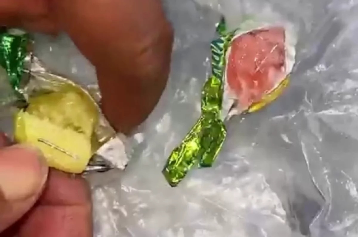 На записи женщина демонстрирует развернутые карамельные конфеты, внутри которых видны фрагменты игл.