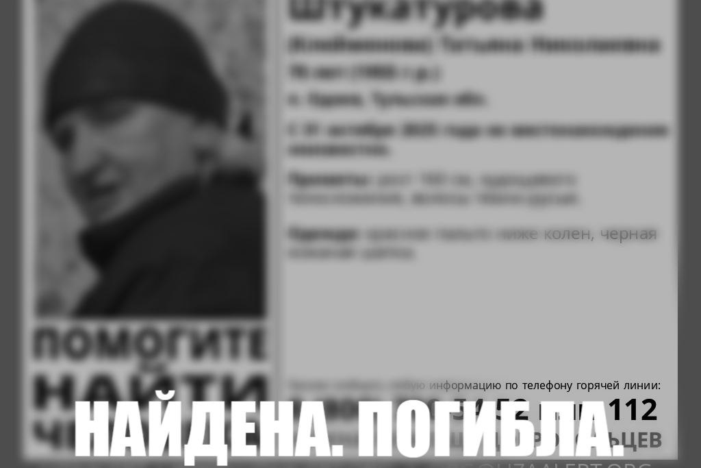 Напомним, что местонахождение пенсионерки было неизвестно с 31 октября 2025 года. На данный момент в отряде появилась ориентировка с подписью "Найдена, погибла".