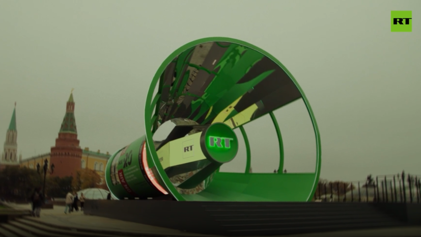 RT установил огромный рупор на Манежной площади в Москве. Этот арт-объект приурочен к 20-летию телеканала. Внутри него находится студия.