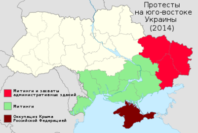 Протесты на Юго-Востоке Украины в 2014 году — общественно-политические акции против украинских властей, в защиту статуса русского языка, под антиправительственными, федералистскими, пророссийскими и сепаратистскими лозунгами, охватившие с конца февраля... Wikipedia (RU)